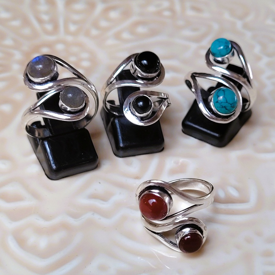 Le set comprend 4 bagues, chacune avec une pierre différente : onyx noir , onyx rouge, labradorite et turquoise d’imitation ,elle existe en finition dorée .