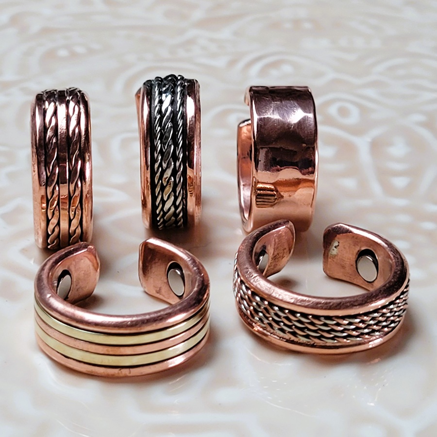 La bague en cuivre Léo intègre des aimants, offrant un effet bénéfique sur les articulations, notamment pour soulager les rhumatismes. Chaque set comprend 5 bagues différentes, à porter seules ou en assortiment. Bien-être et style se combinent pour un look léger et graphique.