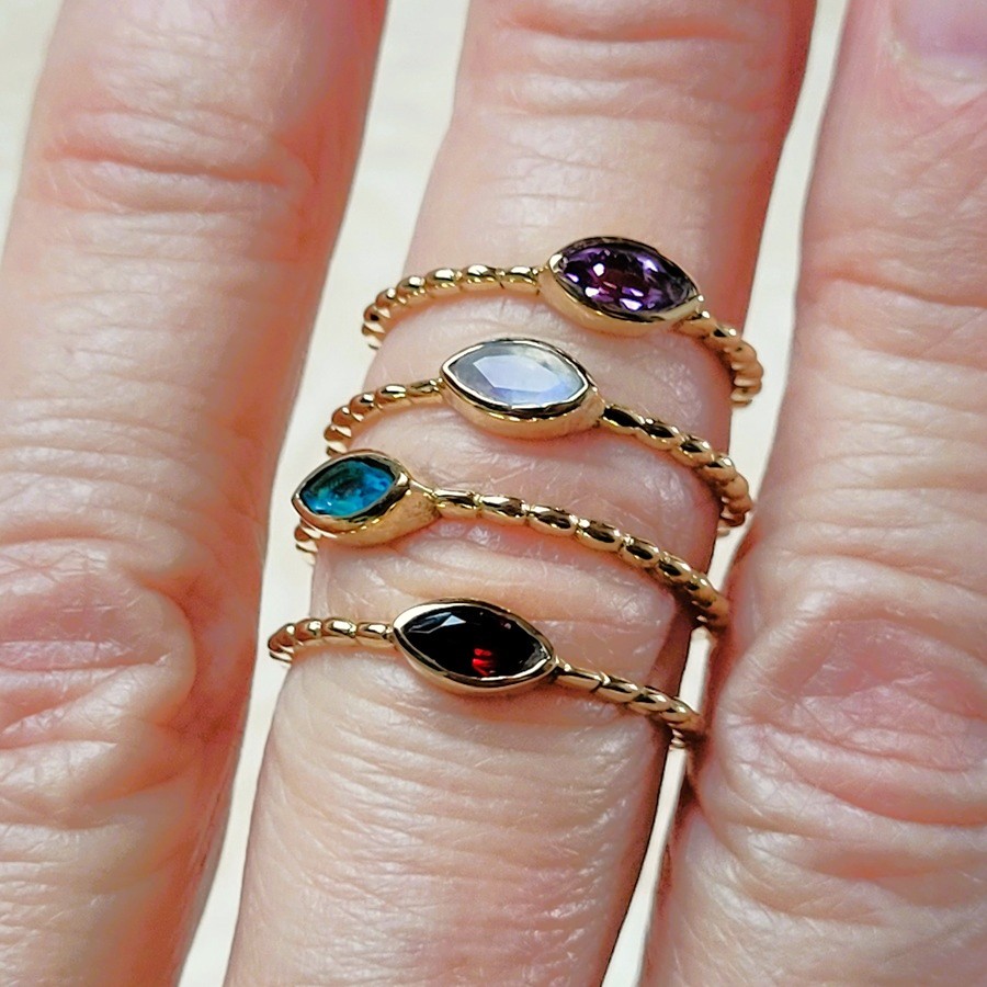 Vendue en set de 3 tailles assorties, elle est proposée avec 4 pierres au choix : grenat, améthyste , topaze bleue ou pierre de lune. Garantie sans nickel, Ninon s’intègre parfaitement dans une offre de bagues fines dorées à forte attractivité.
