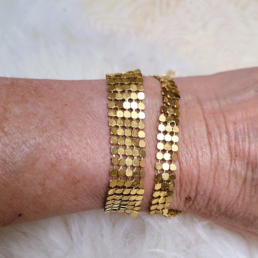 Le bracelet Ava doré « style liquid silver » est un set de 2 pièces souples et raffinées : un petit (1 cm) et un moyen (2 cm), disponibles en plaqué argent . Très fluide, très raffiné, il se porte seul ou assorti au collier Ava.