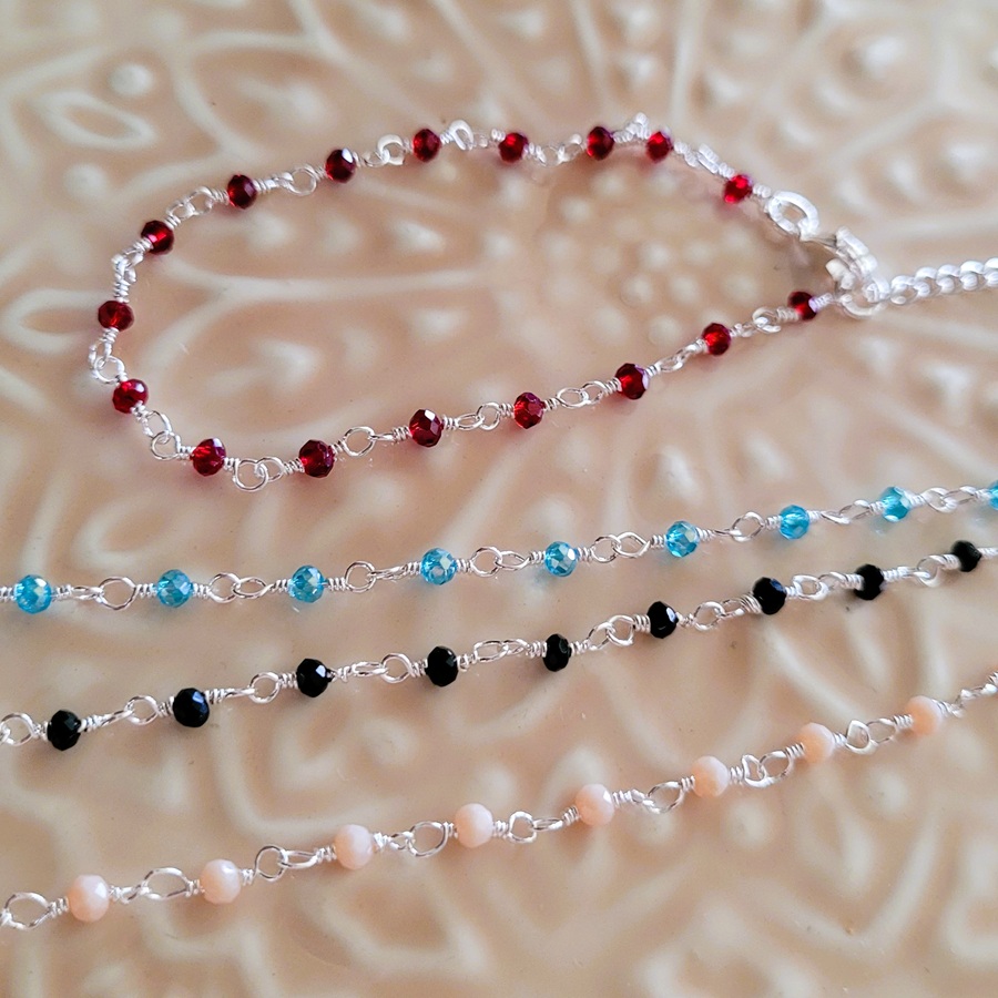 Bracelet chaine argenté Louna ,agrémenté de perles de verre facettées . Le set est composé de 4 bracelets de couleurs assorties ; bleu aqua, noir , pêche et bordeaux . ils sont Garantis sans nickel.