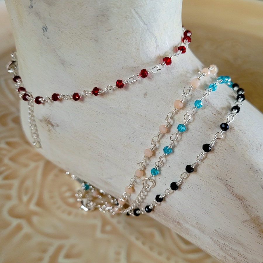 Chaine de cheville argentée Louna , en perles de verre , la chaine est en laiton plaqué argent .Le set est composé de 4 couleurs assorties: pêche , bordeaux , bleu fumé et noir . Elles sont Garanties sans nickel.