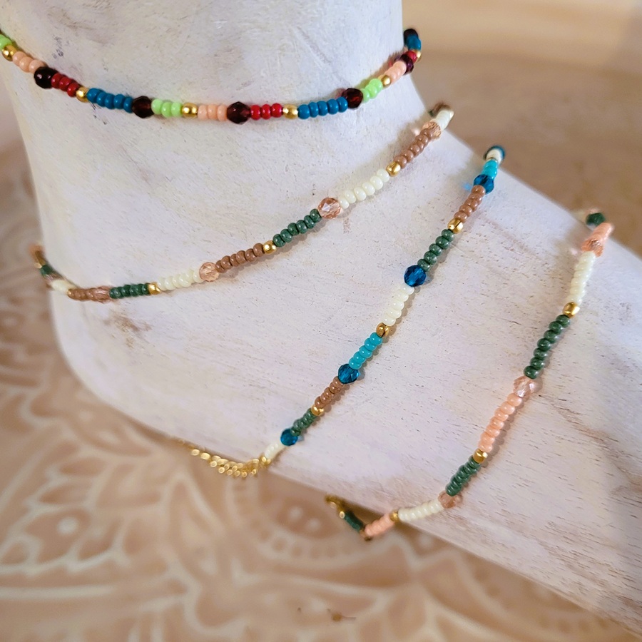 Set de quatre chevilles différentes, réalisées en perles japonaises de rocailles . Ces chevilles s’accordent parfaitement avec les bracelets, colliers et boucles d’oreilles Violaine pour un ensemble harmonieux et bohème chic.