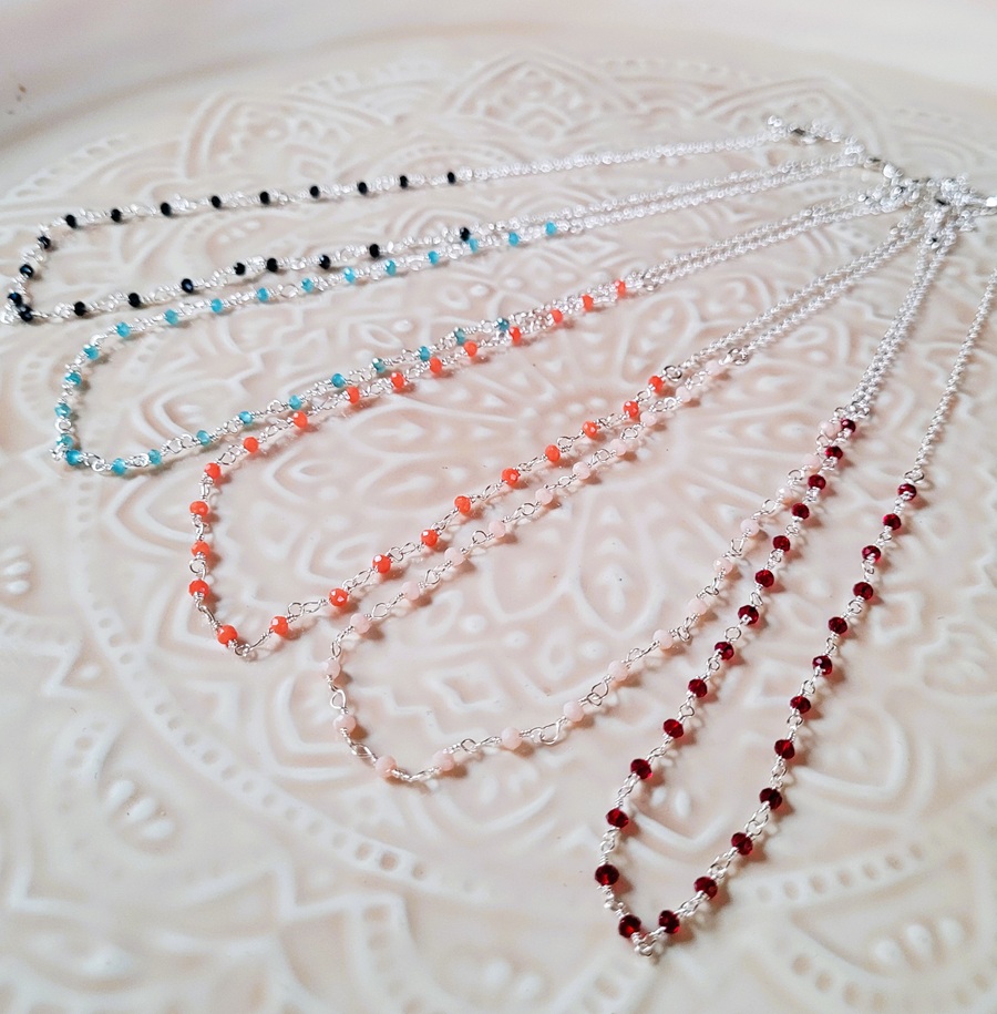 Collier chaine argenté Louna ,agrémenté de perles de verre facettées .. Le set est composé de 4 colliers de 45cm + chainette ajustable 3cm , de couleurs assorties ; turquoise, noir ,bordeaux, pêche et corail . Ces colliers sont Garantis sans nickel. retrouvez ici le bracelet assorti , ou encore la version dorée
