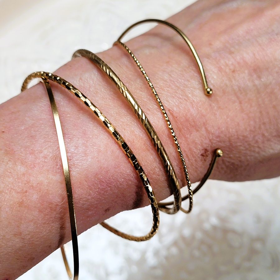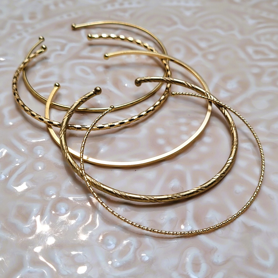 Fins, délicats et faciles à associer, les demi-joncs Zoé dorés jouent sur les textures pour un rendu chic et lumineux. Ce set de cinq bracelets différents mélange fils lisses, torsadés et gravés, pour un effet accumulé élégant et intemporel. Ici la version plaqué argent