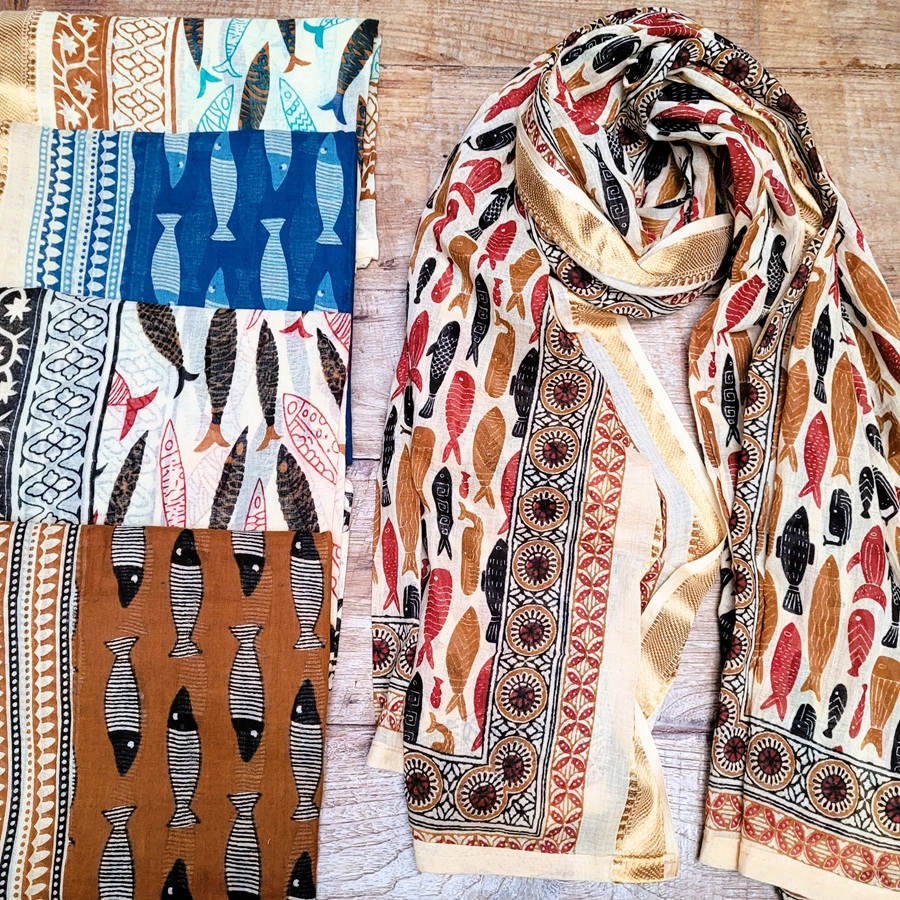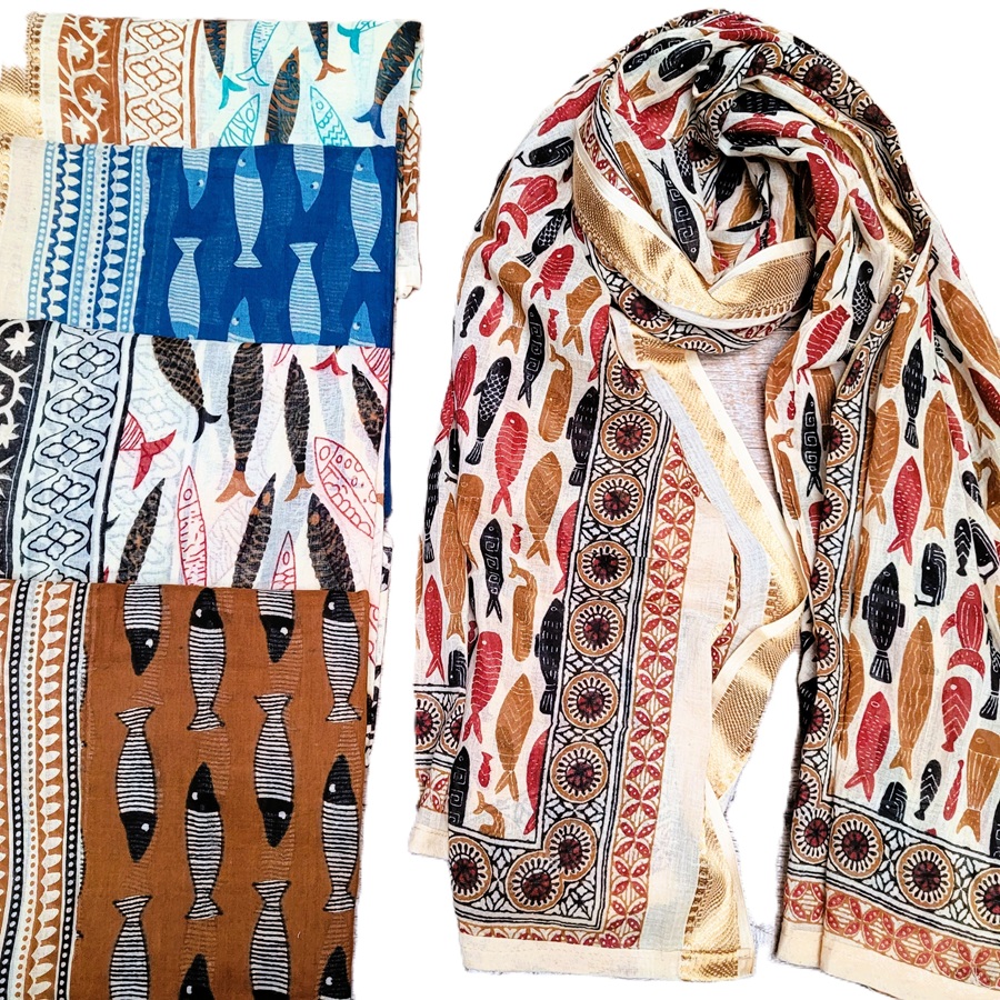 Le grand foulard Circé est réalisé en coton léger aux teintes naturelles et végétales. Ses motifs de poissons apportent une touche originale et décorative.